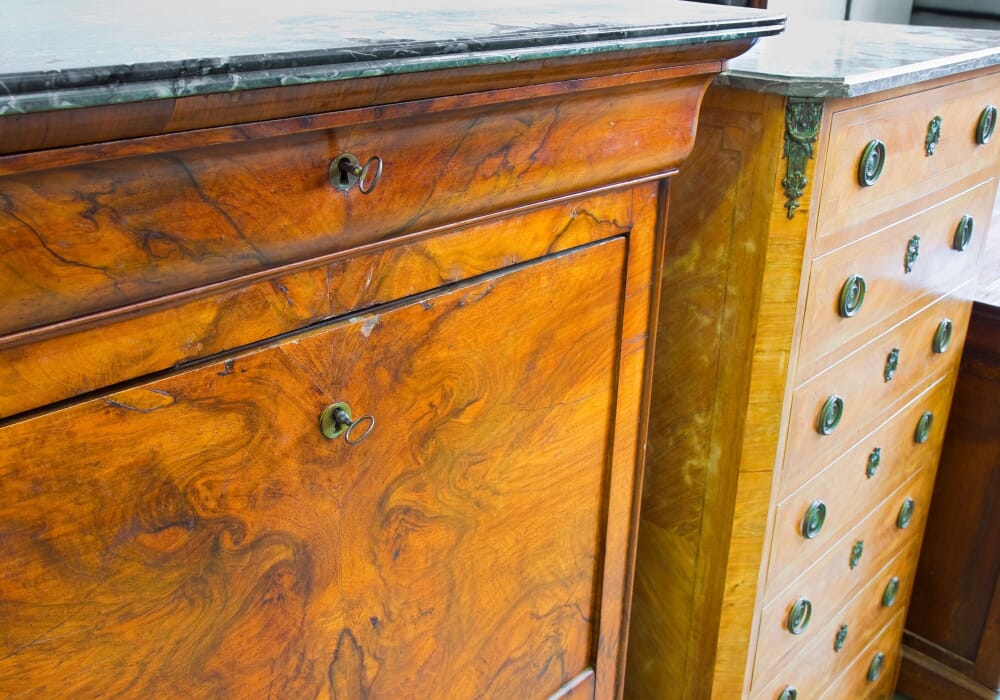 I mobili di questo periodo sono eleganti, raffinati e leggeri, con un richiamo allo stile Luigi XIV. Tra i mobili più ambiziosi di questo periodo spiccano la commode e il secrétaire, che inizialmente presentavano ricche decorazioni in bronzo, madreperla o porcellana. Verso la fine del Settecento, tuttavia, le decorazioni si sono semplificate, ispirandosi all'eleganza classica.