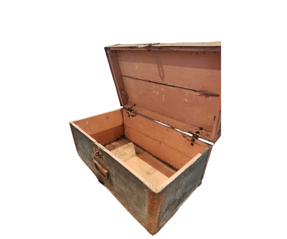 Questo baule antico in legno e metallo è il complemento ideale per chi ama il fascino del vintage e degli oggetti dal carattere unico. La patina del tempo che lo riveste aggiunge un aspetto vissuto e autentico, conferendo al baule una storia che si riflette nel suo aspetto. Ancora visibile il colore originale, il pezzo è perfetto per gli appassionati di oggetti antichi che desiderano aggiungere un tocco di nostalgia e storia al proprio arredamento.