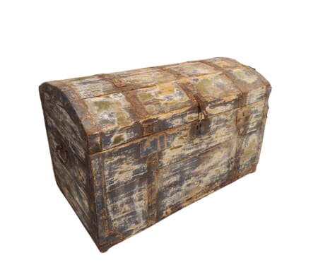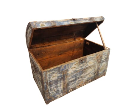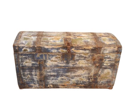 Questo baule ampio, realizzato in legno con coperchio a cupola, è un oggetto che racconta storie. La finitura particolare lascia intravedere delicate tracce di pittura blu e verde, evocando il fascino di un pezzo antico.