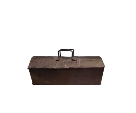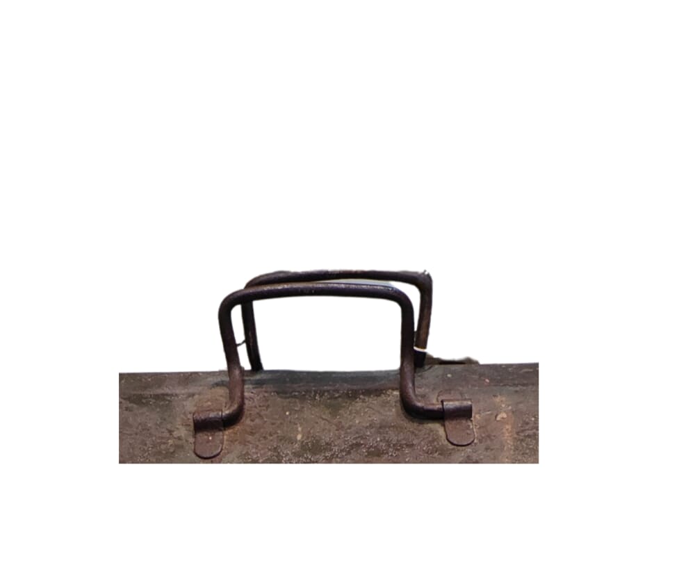 Questa cassetta è un pezzo che porta con sé la storia e l'autenticità di un'epoca passata. Il suo aspetto robusto e vissuto, con segni del tempo che raccontano storie di viaggi e usi intensi, la rende un oggetto unico e affascinante.
