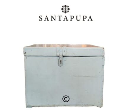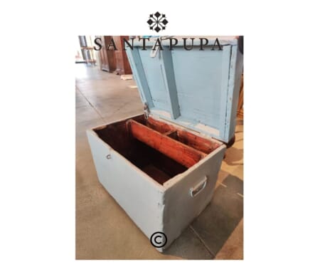 Immagina questa cassetta collocata accanto a una poltrona, utilizzata come tavolino d’appoggio per libri e piante, oppure posizionata in un ingresso come contenitore decorativo: il suo colore celeste delicato e il aspetto vissuto donano immediatamente calore e personalità all’ambiente.