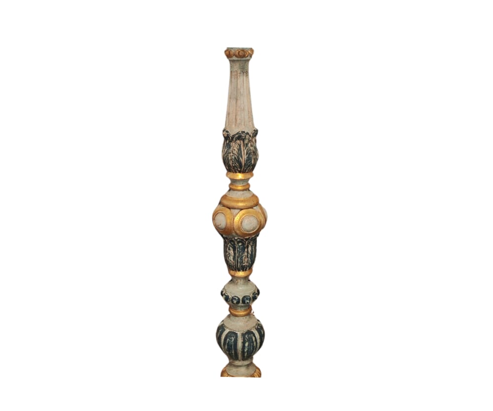 Struttura Lavorata Artigianalmente: Il fusto, riccamente intagliato e rifinito in tonalità dorate, bronzo e avorio, è un trionfo di forme barocche e dettagli ornamentali. Ogni elemento è curato nei minimi particolari, conferendo alla lampada un’eleganza senza tempo.