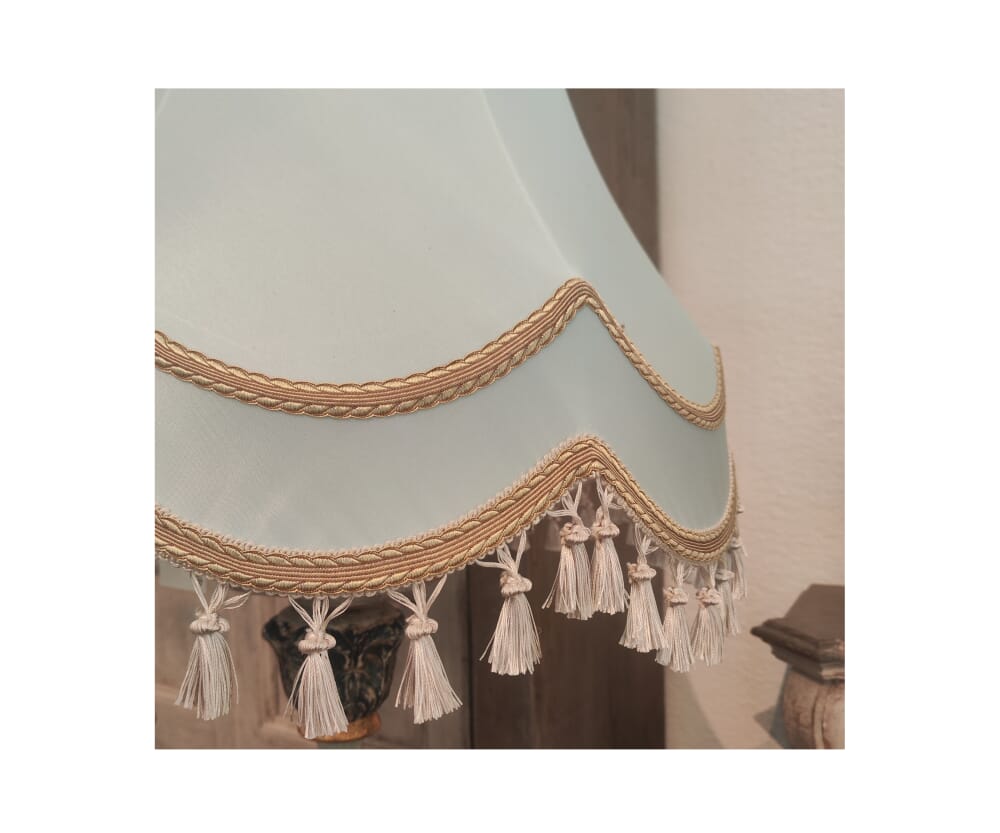 Paralume Decorato con Frange: Il paralume è realizzato in tessuto chiaro con passamaneria dorata e nappine pendenti: dettagli che richiamano il fascino degli interni d’epoca e creano una luce calda e avvolgente.