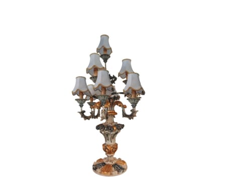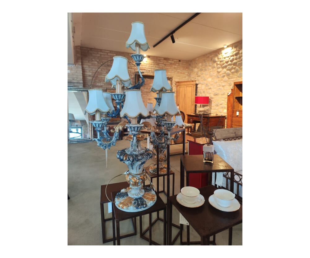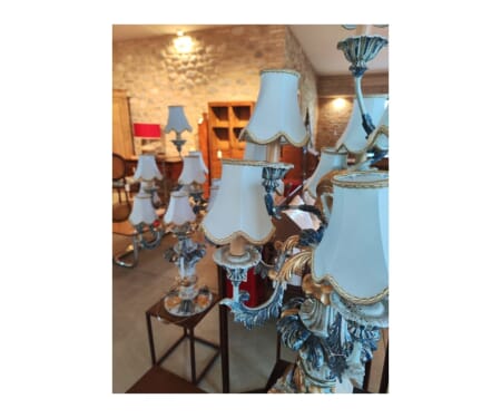 Materiali di Alta Qualità: La struttura, riccamente decorata, presenta finiture dorate e dettagli in stile antico, con paralumi in tessuto che diffondono la luce in modo caldo e avvolgente. Ogni elemento è studiato per offrire una sensazione di eleganza senza tempo.