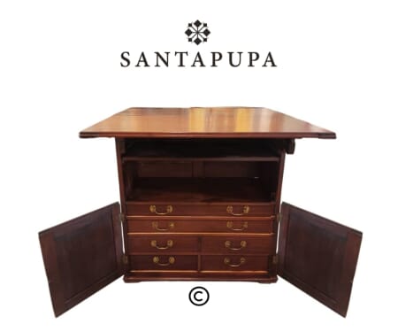 Questo raffinato mobile inglese, risalente ai primi del ’900, è realizzato in pregiato legno di mogano, materiale apprezzato per la sua robustezza, la durata nel tempo e il tipico colore caldo e profondo. Caratterizzato da ante frontali e numerosi cassetti interni, rappresenta un perfetto equilibrio tra funzionalità, eleganza e artigianalità.