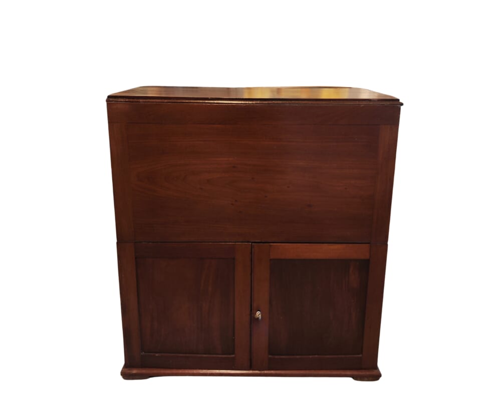 Immagina questo mobile collocato in uno studio dallo stile tradizionale: la lucentezza del mogano accende l’atmosfera, mentre i cassetti e il vano superiore custodiscono documenti, strumenti o oggetti preziosi. Oppure pensa a un salotto d’ispirazione inglese, dove il mobile diventa un punto focale elegante e ricco di carattere, capace di raccontare la propria storia attraverso la bellezza del legno e i dettagli originali.