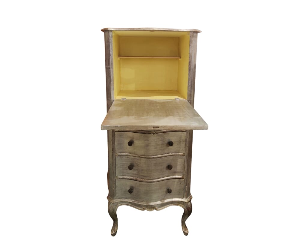 Visualizza un angolo della camera o dell’ingresso: la luce si posa sulla superficie argentata, creando riflessi morbidi; i cassetti scorrono rivelando la loro capienza, mentre il profilo sinuoso del mobile dona grazia alla stanza. Ogni dettaglio di questa secretaire parla di tradizione, artigianalità e stile, arricchendo l’ambiente con un’eleganza senza tempo.