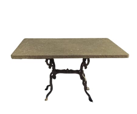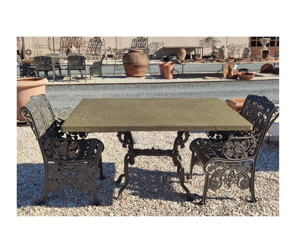 Materiali di Pregio: Il tavolo unisce la solidità della ghisa, forgiata in uno stile decorativo dal gusto retrò, alla raffinata naturalità del peperino, pietra lavica resistente agli agenti atmosferici e dall’aspetto autentico.